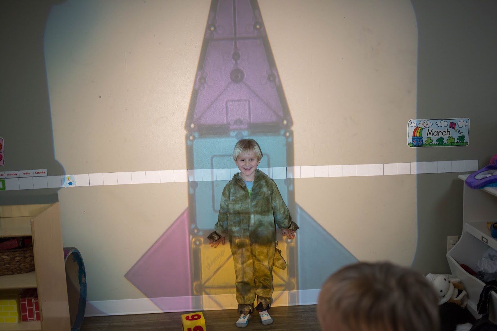 | This child is trying to move the rocket by pushing it up. Prior to this, the children standing at the projector were making the rocket ship blast off. This child has yet to connect the cause and effect factor of playing with the overhead projector. |