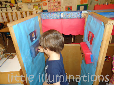 We converted our puppet theater, using shoe boxes, pictures of the candidates, and index cards with a big sticker for the ballot.
