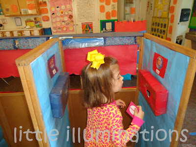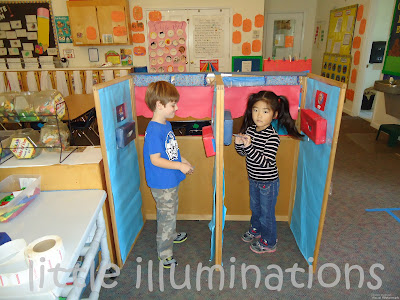 Tomorrow is ELECTION DAY here in the U.S.! Politicians will be campaigning, citizens will be voting. The children will have the day off, as most of the schools in our area are voting precincts. By Wednesday, we will know who will lead our country for the next four years. I've already voted, and was proud to take my youngest daughter with me to the polls for her very first time! I want my vote to be counted. I won't tell you who I voted for---that's personal, and quirky as it may be, I don't even share that with my husband or children. It's serious business, much too serious for kids. Or is it? While many of the political issues may be WAY over their heads, many will stand at their parents' side as ballots are cast. Children are curious about what is going on. I think voting (and making our individual voices heard and counted) is one of the MOST important things we can do as American citizens, and it is never too early to help the children understand how important voting is. Lately, we've had a couple of discussions about politics. We talked about the reason we vote, and how that is our chance as a citizen to let our voice be heard. I relate it to the children's jobs at school, and how different people might do a job differently, using simple terms in a way they might understand. We vote on a variety of things in preschool, so they got the basic idea. We've set up a voting booth so the children can vote on who they think will win the election. These are pictures from one of our previous election booths in Pre-K.