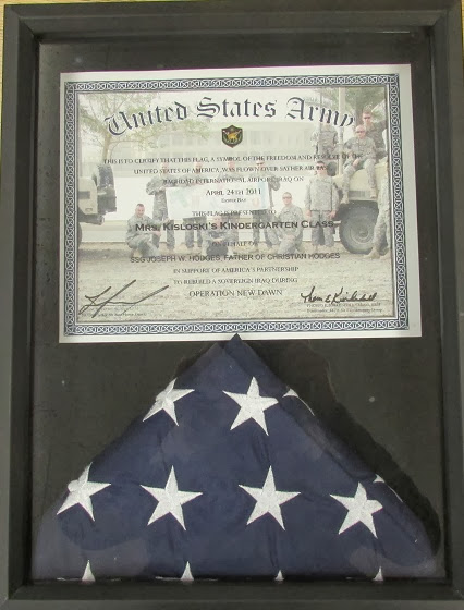 A few years ago, one of my student's dads was stationed in Iraq. Our class wrote notes and sent packages to his troop ( twenty six of them!) all year long. They were awesome about writing back and sending pictures. They sent us this very special flag that flew on Easter day in Iraq with a picture some of the men and women we wrote to holding a big THANK YOU banner. My classes love studying this picture.