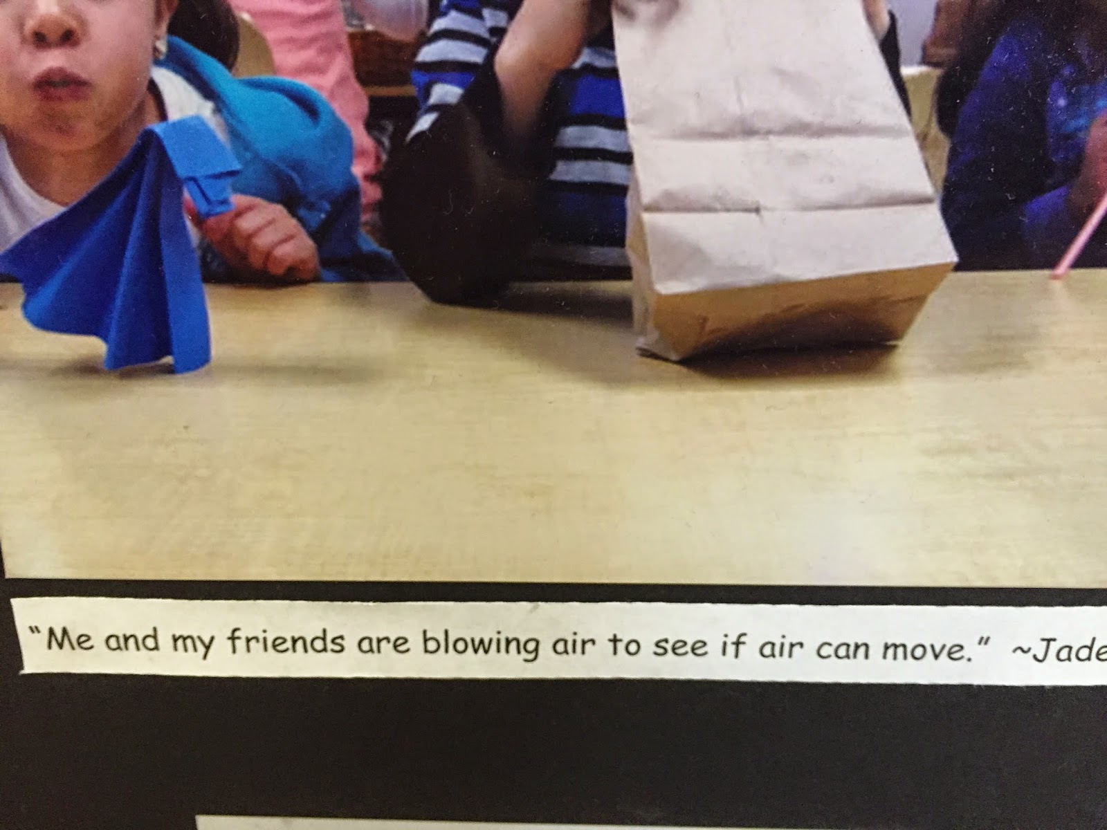 This next example could be considered a form of biological science if your focus is on the bag or the air, but it could be earth science if the focus is on the human being producing the air. Either way the idea of experimenting to see if air can move is a big idea that has led to alternate forms of energy. Encouraging children to recreate that information on their own allows them to take roads travelled by some very well known scientists and perhaps beyond.... oh the places you'll go!