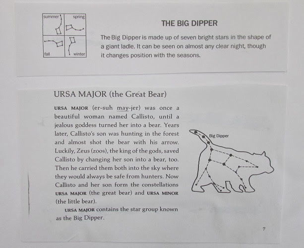 You could mix your constellation-themed activities among your shelves according to curriculum area. Or you could have a special constellation-themed area something like the one pictured. My shelves this month have a mixture of skill levels. Many of the activities can be adapted for a variety of levels. If you’re a homeschooler, just choose the activities that work for your child’s interests and ability levels. If you don’t have room for all the activities you’d like to do, simply rotate them.