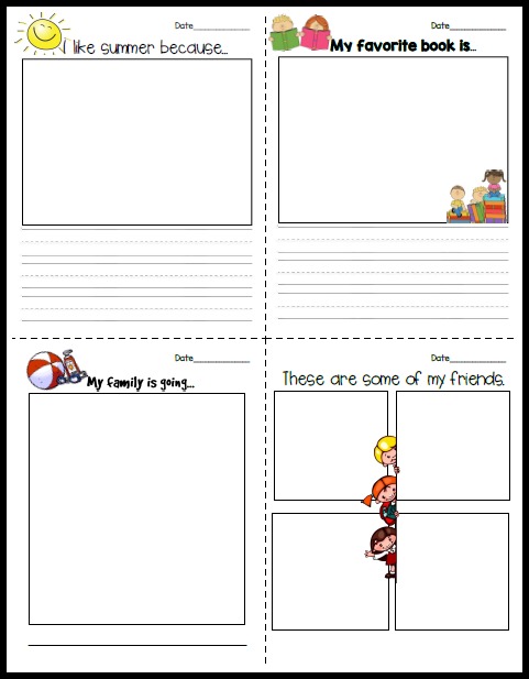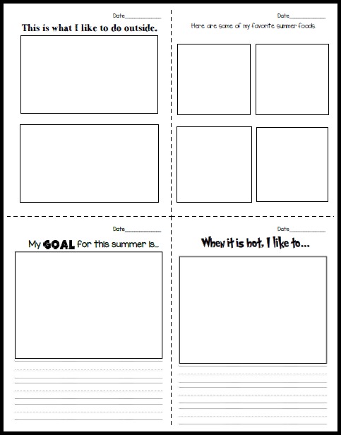 There are 4 different covers you can use for the book- OR you could print out some prompts, put them in a pocket folder for each student, and encourage the children to add "summer treasures" to the folder. They can include things like ticket stubs, pamphlets from trips, or pictures.