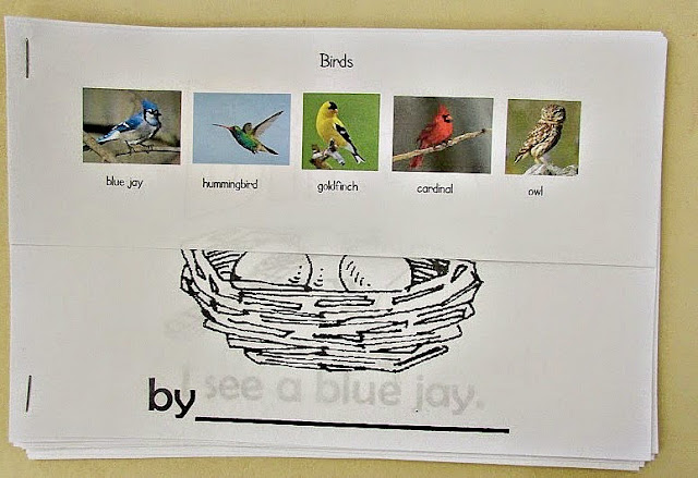 My fiction books about birds (in another part of the room) are a variety of Montessori-friendly books and books that aren't Montessori-style books but are simply fun. You could mix your backyard bird-themed activities among your shelves according to curriculum area. Or you could have a special backyard bird-themed area something like the one pictured. My shelves this month have a mixture of skill levels. Many of the activities can be adapted for a variety of levels. If you’re a homeschooler, just choose the activities that work for your child’s interests and ability levels. If you don’t have room for all the activities you’d like to do, simply rotate them.