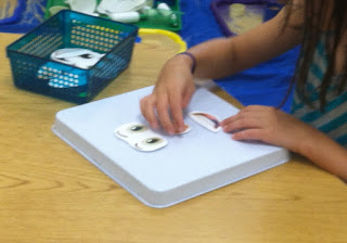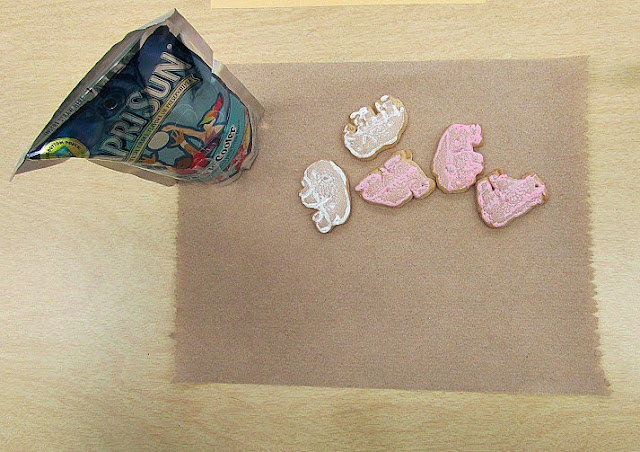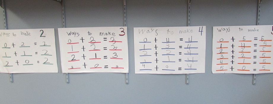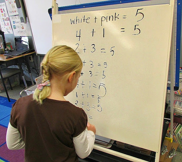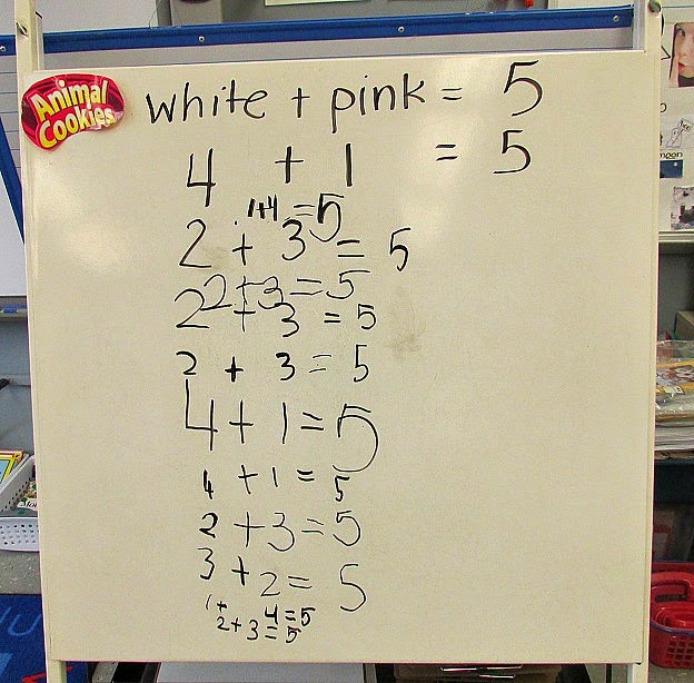 Snack time is another great chance to work on math facts. We have been working on reviewing our facts of five, so I gave everyone 5 animal cookies out of the bag. Then, one at a time, they each came to the board to write their five fact, by writing how many white cookies and how many pink cookies they had. This was great for fluency practice, because we kept reading the math sentences and noticing how many were the same.