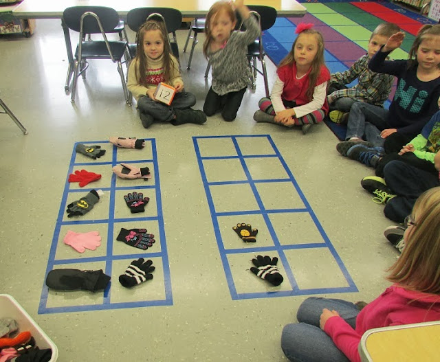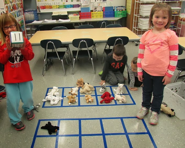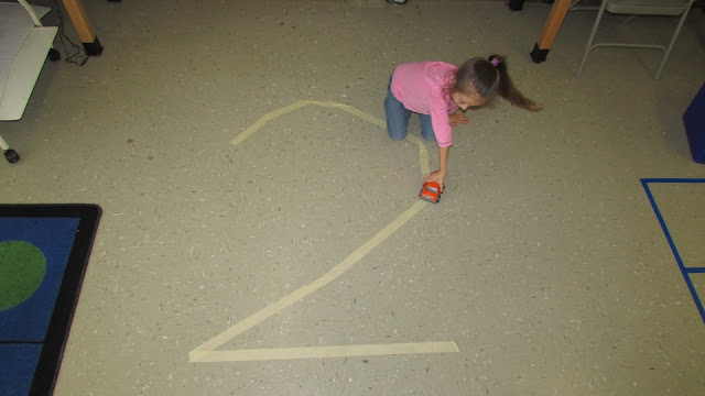 Create life size ten frames on the floor for lots of fun counting activities. When the ten frames are on the floor, the children will create their own word problems and counting activities during free play time- just because the ten frames are there! You will be amazed the math conversations and problem solving that will be taking place- all on their own. It's handy to have the ten frames set up so you can quickly do an activity with them if you have a few minutes.