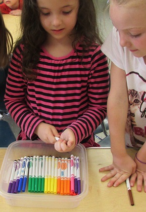 When our crayon boxes get all mixed up, I dump all the crayons from all the boxes. The kids sort them into color piles, then each grab a color to put one of each crayon in each box to sort them. They love it. (And it's a great help.)