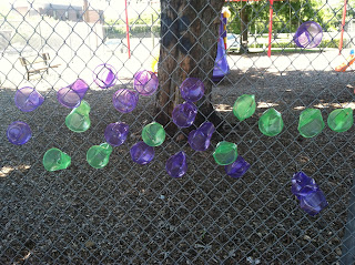 Some colorful plastic cups and a chain link fence make great basic materials for sculpture. Encourage kids to create a design or let them place cups randomly. The overall effect is really cool. (And a great way to exercise those fine motor skills! Manipulating cups into the fence can be a challenge.)