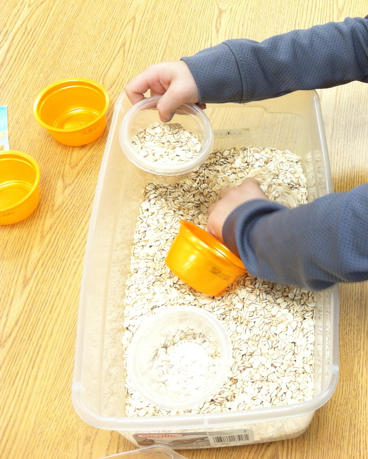 Place cups with sand, water, grain, or whatever you want to scoop and pour. Kids will enjoy experimenting with scooping, filling, and pouring materials. Cups of any size can be used, but I'd recommend smaller cups for this purpose. (You have less in a cup at a time that can cause a mess.)